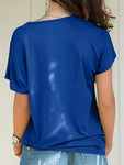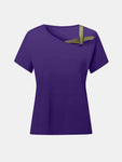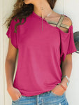 - Add a modern twist to your wardrobe with this asymmetrical neck short sleeve t-shirt.
