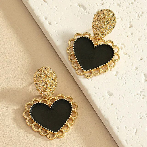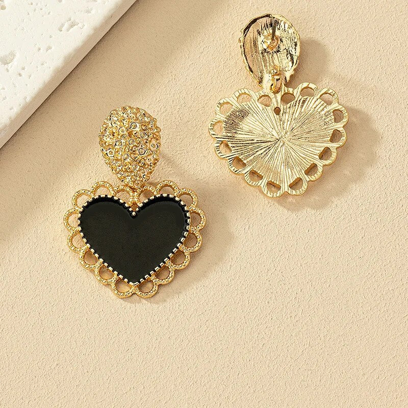 - Crafted with the finest alloy and adorned with a stylish black epoxy metal heart pattern, these earrings will add a touch of vintage allure to your look.