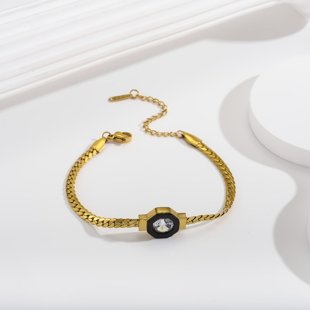 - This chic bracelet and necklace set features clean geometric shapes in a titanium steel body adorned with sparkling zircon.