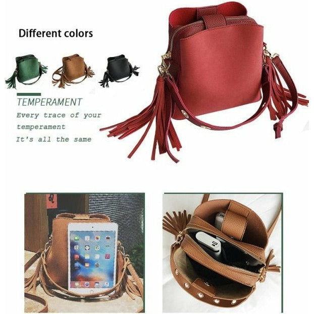 - This Tap Fashion Women's Double Tassel Multi-Pocket Sling Bag is crafted from tough, high-quality faux PU synthetic leather. Which takes hits well and looks even better with age.